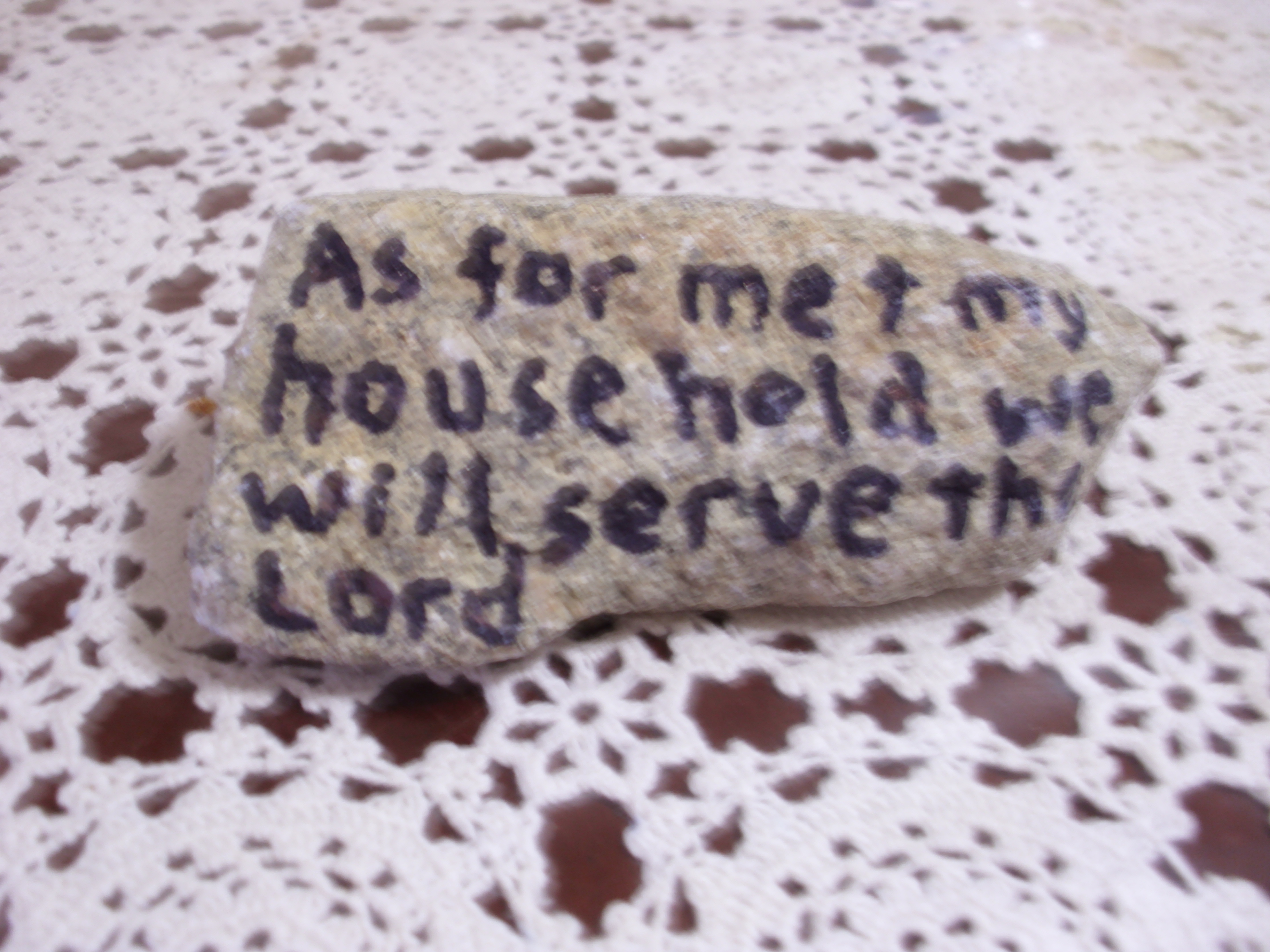 I would like to invite the worship team to come forward at this time. In front of the altar today we have a bunch of rocks. And on each rock is printed these words, “As for me and my household we will serve the Lord.” And just us Joshua set up a rock to be a witness, to everyone who passed by, that in that place, on that day, the people had rededicated themselves to God, so also these rocks can be a witness to everyone who sees them that, on this day in this place, you and your household have rededicated yourselves to God.