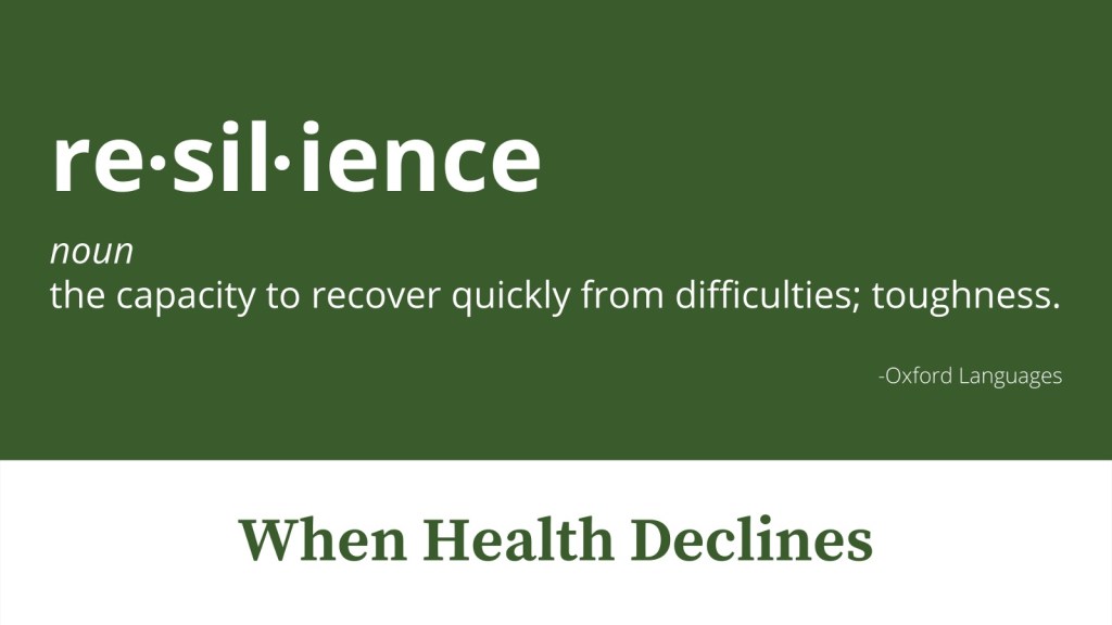 The good news is that, ever since the dawn of time, God’s people have endured hard times with resilience. So we are going to look at examples in the Bible of God’s people displaying resilience so that we can learn from them. And then we are going to look at passages in the Bible that show us how Jesus is our ultimate source of resilience. My hope and my prayer is that, by the end of this series, you will be confident that Jesus will help you to face whatever this world may throw at you. Today we are thinking about how we can have resilience when health declines.