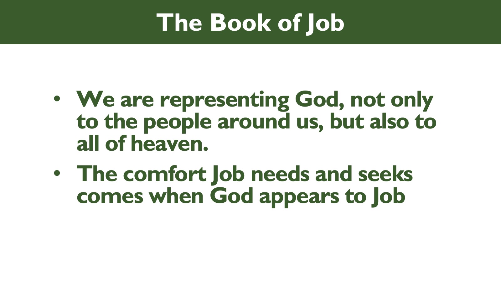 The first main point of the book of Job is that you and I, as we go about our everyday lives, are representing God, not only to the people around us, but also to all of heaven. So the actions we take and the decisions we make when we suffer have implications both for heaven and for earth, both for now and forever.