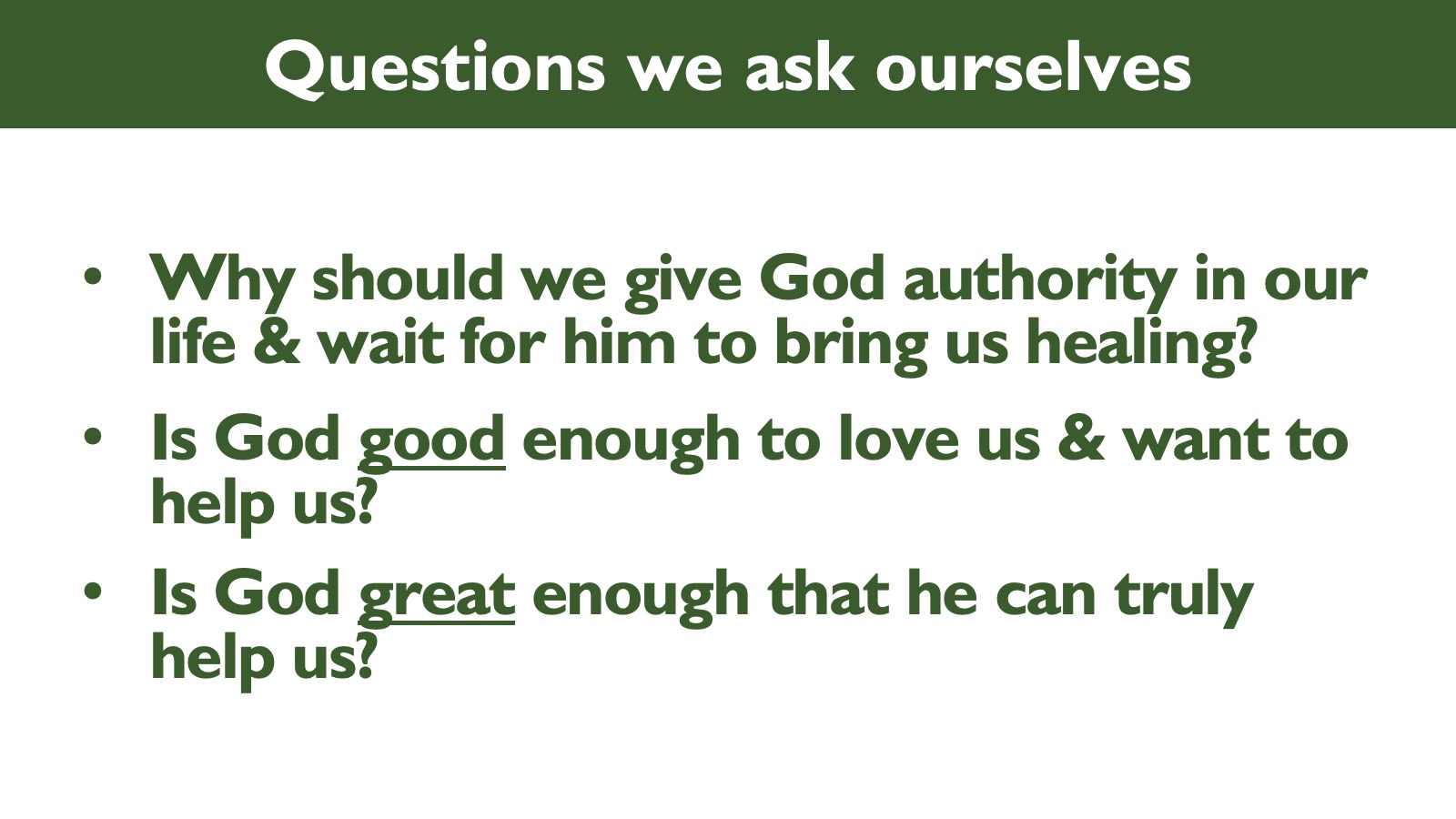 Waiting is hard and life is uncertain, so why should we give God authority in our life and wait for him to bring us healing? This is the question that runs in the background throughout the book of Job. Another way to ask this question is to wonder, is God good enough to love us and want to help us? And is God great enough that he can truly help us? These are questions we all need to answer for ourselves. Because without a resounding “yes” to those questions in our heart, we will tend to hold God off at a distance, not fully trusting him with our lives because we are not totally convinced that he is trustworthy.