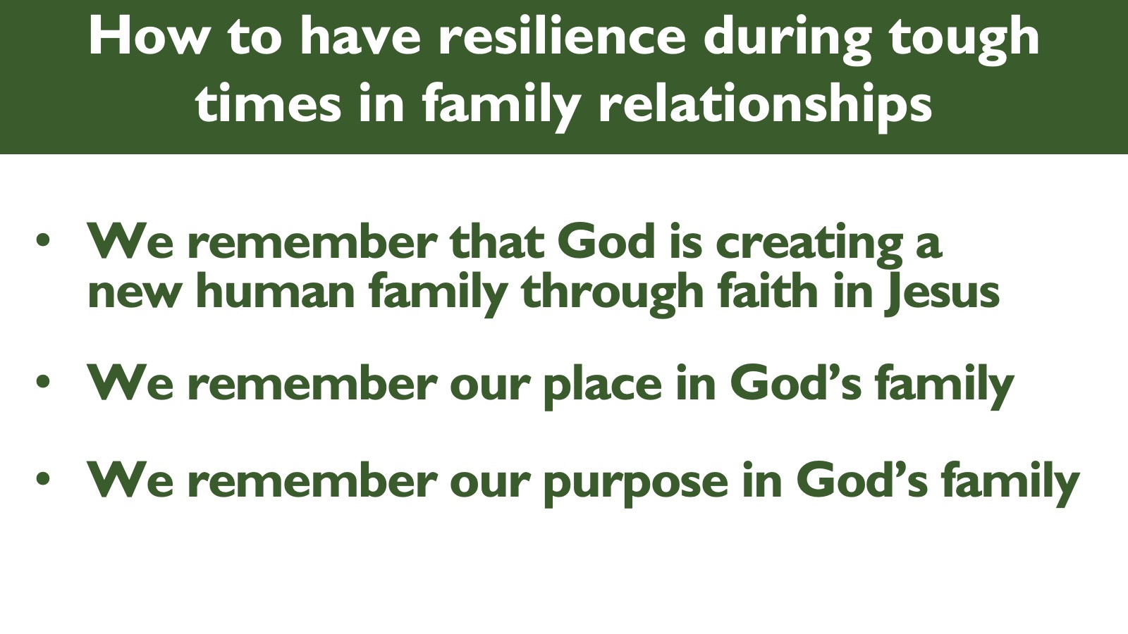 So how do we have resilience when going through tough times in our family relationships? First, we remember that God is creating a new human family through faith in his Son, Jesus Christ. When our first parents rebelled against God and all of creation was corrupted, and headed for eternal condemnation as a result, God could have walked away from this broken world, but he didn’t. Because he loves you and all people in the world, God the Father chose to send his Son into this world to become one of us. The God-human Jesus lived a perfect human life that counts as goodness for all people everywhere. Because he loves us, Jesus willingly went to the cross to suffer and die to pay the full cost of forgiveness for all our sins so we could have a living relationship with the God who loves us. Not only that, through his resurrection from the dead on the third day that followed, Jesus started a new creation. As we read in 2 Corinthians 5:17, Therefore, if anyone is in Christ, he is a new creation. The old has passed away; behold, the new has come. (2 Cor. 5:17 ESV) The moment you believed in Jesus as your Savior, he brought to life within you a new person, and that new person is a beloved, forgiven child of God. That new person is who you really are. That new person is who Jesus will raise from the dead at the end of time with your dusty, dead old body made new again so that it will never grow old, never get sick and never die. All of creation will also be restored and made new and you will live with Jesus forever, seeing him face to face, in the new heaven and earth to come.