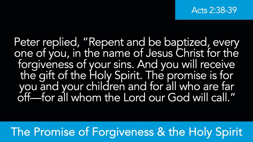 Peter replied, “Repent and be baptized, every one of you, in the name of Jesus Christ for the forgiveness of your sins. And you will receive the gift of the Holy Spirit. The promise is for you and your children and for all who are far off—for all whom the Lord our God will call.” (Acts 2:38-39)