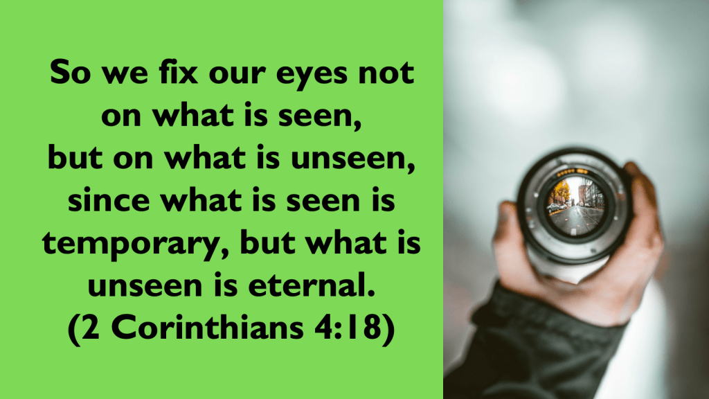 So what does it mean to live our lives now through the lens of eternity? It means that we shift our focus from our life now to our life in eternity. And then, from our vantage point in our eternal life, we look back on our life now. Though it might seem to our natural minds as though this is a strange thing to do, when our mind is made new through faith in Jesus, we will realize that this is what living in truth and actual reality is really like. This is what Paul is telling us in 2 Corinthians 4:18 when he writes, So we fix our eyes not on what is seen, but on what is unseen, since what is seen is temporary, but what is unseen is eternal. (2 Corinthians 4:18)