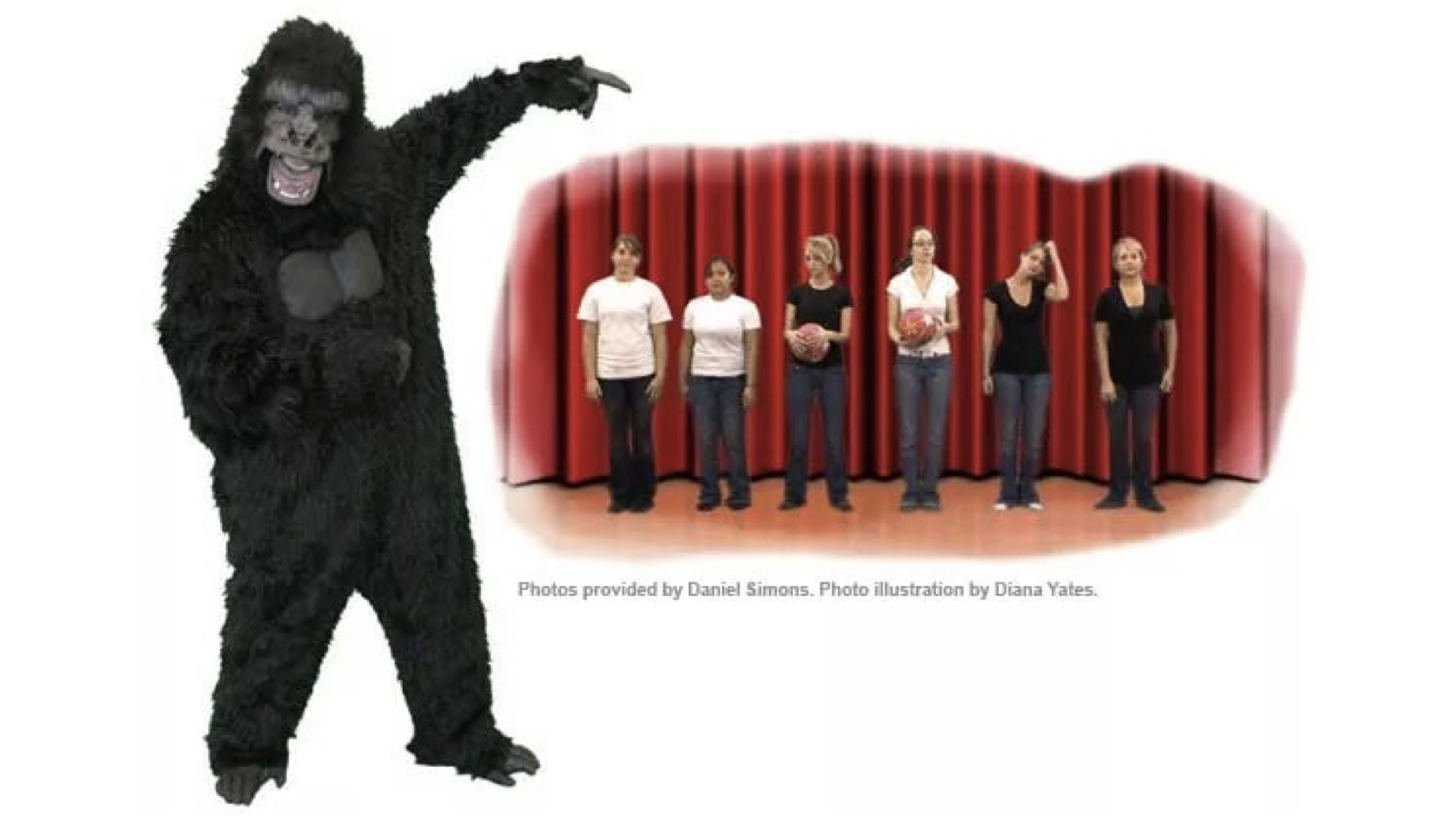 A few years ago, Christopher Chabris and Daniel Simons ran a special test where they showed test participants a video of six people, three in white shirts and three in black, and asked the viewers to keep track of how many times people in white shirts passed a basketball. What they didn’t tell their viewers ahead of time was that in the middle of the video a gorilla would walk through the players, face the camera, thump his chest, and then leave, appearing on screen for a total of 9 seconds. If you were one of the test participants, do you think would see the gorilla? When Chabris and Simons ran this test on people at Harvard University, they found is that half of the people who watched the video and counted the passes totally missed the gorilla. And when I took this test myself, I didn’t see the gorilla either. This has become known as the Invisible Gorilla test and from it Chabris and Simons concluded that we are missing a lot of what goes on around us and we have no idea what we are missing. What happens is that we can be so focused on one thing that we totally miss something else. So they did more research about other assumptions we make about our minds are incorrect and they put the results into a book called The Invisible Gorilla.[i]