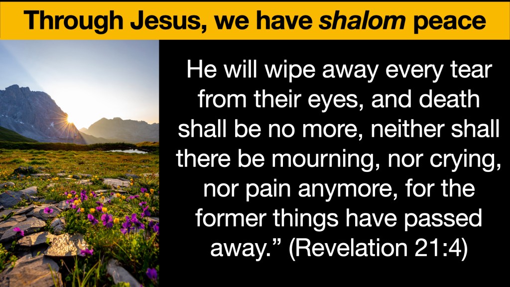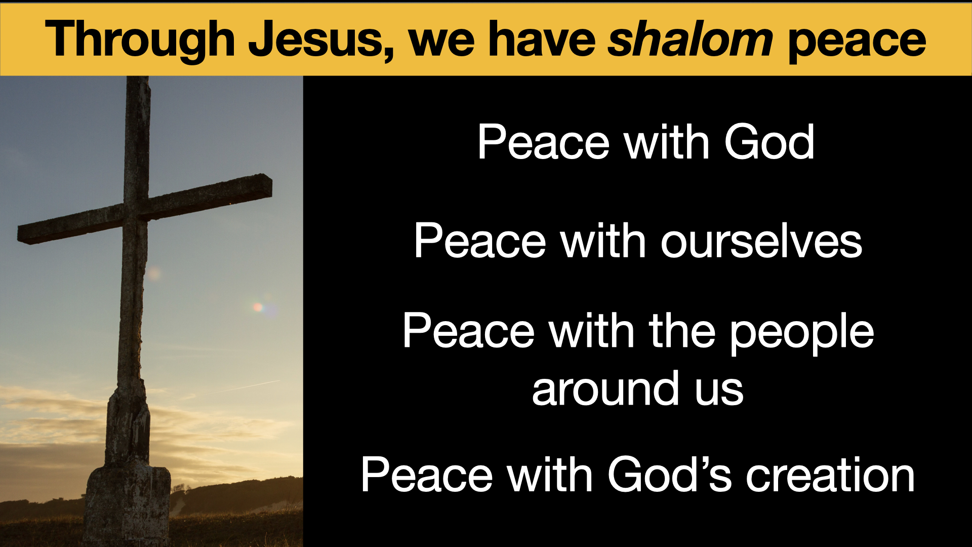 This is what the Hebrew word for peace, shalom, means. It is peace in all our relationships, peace with God, with ourselves, with the people around us and with God’s creation. And the future fulfillment of that shalom peace is a present reality that we live in right now.