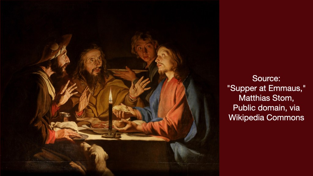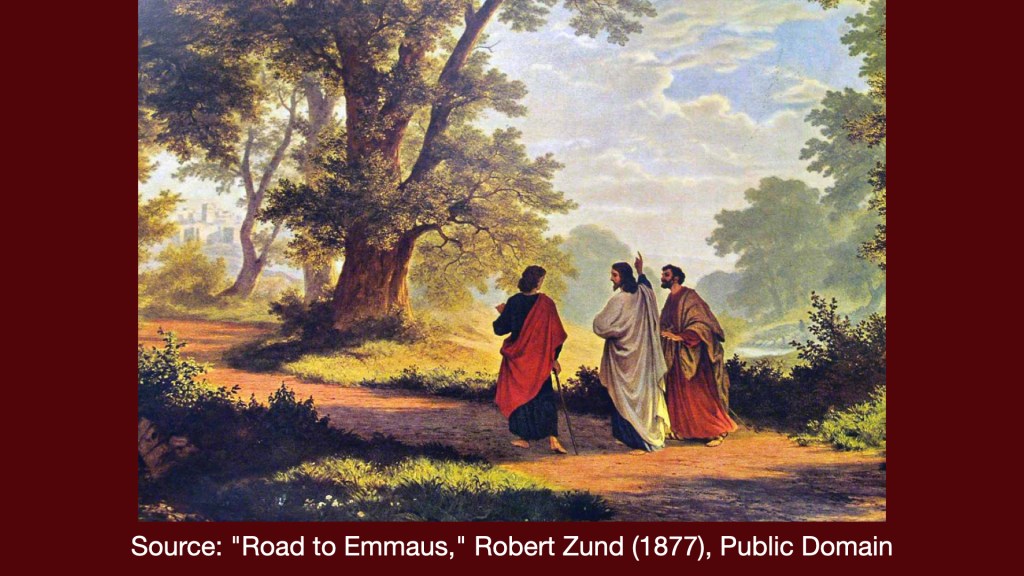 As we do that, we see that two followers of Jesus are walking, on a Sunday, from Jerusalem to their home in Emmaus, a small village a few miles away. Luke tells us that one of them is Cleopas, who may have been one of the eyewitnesses that Luke interviewed as he put together an orderly account of the life of Jesus. The other Jesus follower is not identified, but it might have been Cleopas’ wife.
