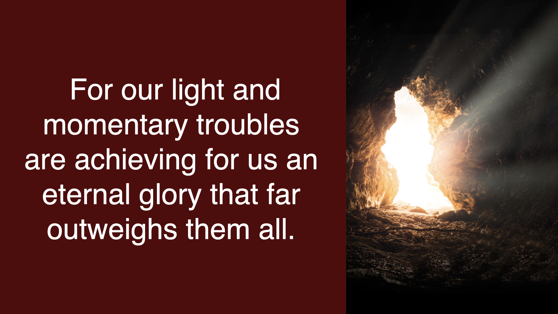 With the resurrection of Jesus as our chief ruling belief we see our problems as opportunities that God is using to draw us closer him and transform us to be more like God the Son, Jesus Christ. As Paul wrote to the church in Corinth, Therefore we do not lose heart. Though outwardly we are wasting away, yet inwardly we are being renewed day by day. For our light and momentary troubles are achieving for us an eternal glory that far outweighs them all. So we fix our eyes not on what is seen, but on what is unseen, since what is seen is temporary, but what is unseen is eternal. (1 Cor. 4:16-18)