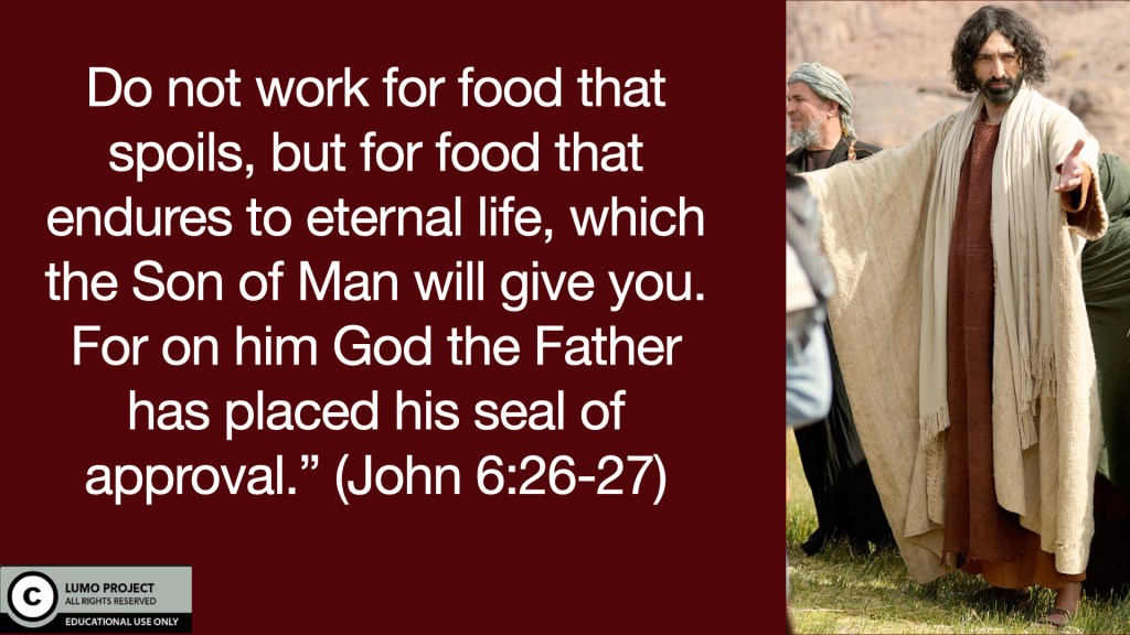 The next day, the crowd in the location where Jesus had fed them and they realized that Jesus and the disciples were gone. They also noticed that only one boat was missing, so they couldn’t figure out how it had all happened. Some boats had come ashore nearby, so they boarded them and headed to Capernaum. When they found Jesus, they asked, “Oh, when did you get here?” Jesus, as He often does in the Bible, responded by addressing the heart issue rather than answering the surface question. He said to them, “Very truly I tell you, you are looking for me not because you saw the signs I perform but because you ate the loaves and had your fill. Do not work for food that spoils but for food that endures to eternal life, which the Son of Man will give you. For on Him, God the Father has placed His seal of approval.” (John 6:26-27)
