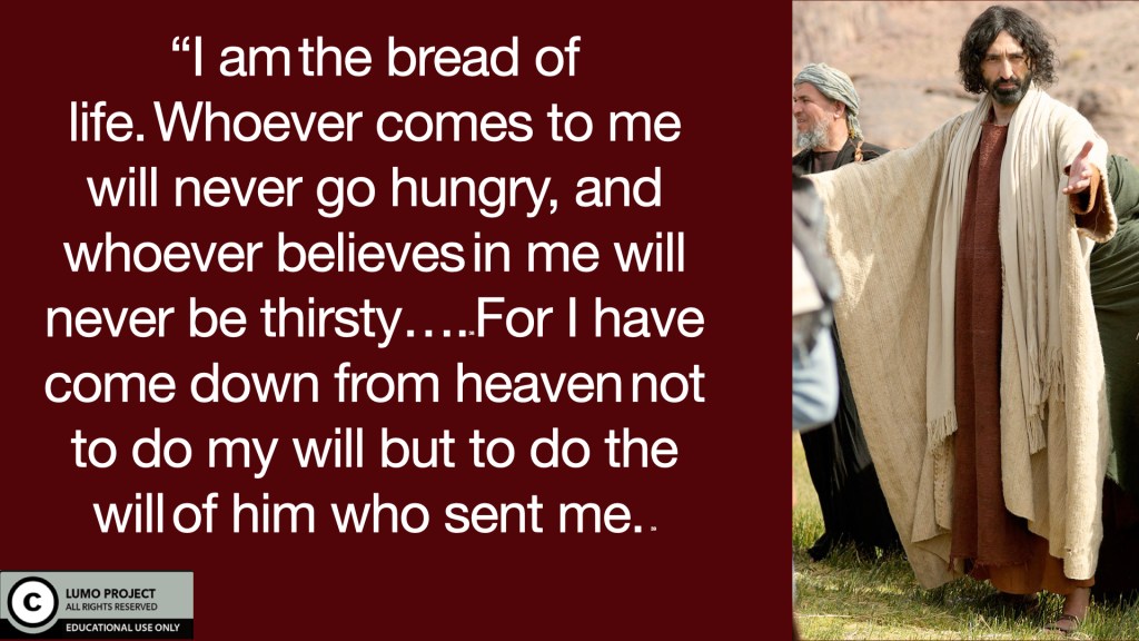 Now Jesus is taking things up a level. He is not only telling the people that it wasn’t Moses who fed the Israelites in the wilderness, it was God. He is also saying that there’s something even greater, and it’s right in front of you. And he goes on to say, “I am the bread of life. Whoever comes to me will never grow hungry, and whoever believes in me will never be thirsty. For I have come down from heaven, not to do my will, but to do the will of Him who sent me. And this is the will of Him who sent me, that I shall lose none of all those He has given me but raise them up on the last day. For my Father’s will is that everyone who looks to the Son and believes in Him shall have eternal life, and I will raise them up at the last day.” (John 6:35, 38-40)