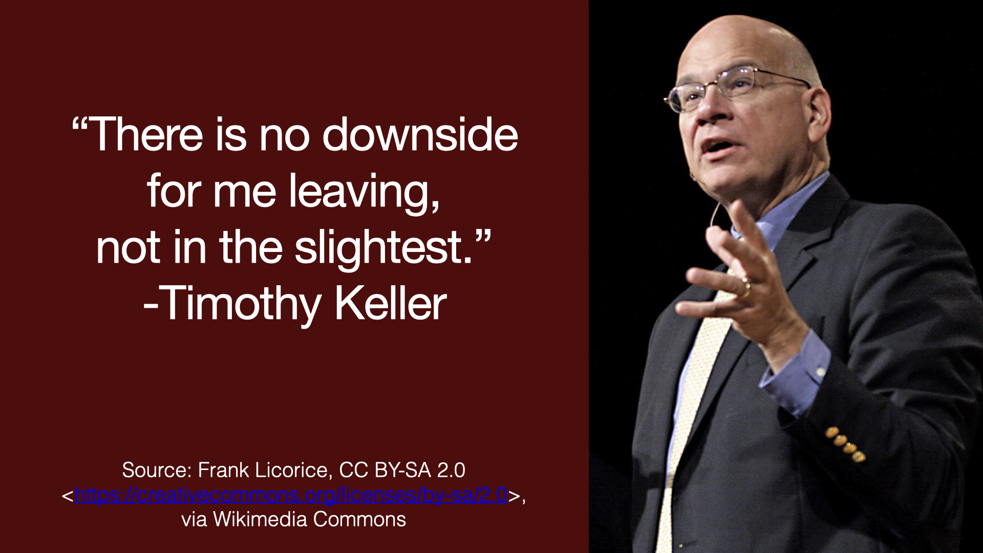 “Oh, I haven’t read any,” she replied. “I just listen to your sermons” [and you’re quoting them all the time.] Over the past 26 years that I’ve been in the ministry, many of the prominent pastors that I looked up to have fallen for one reason or another, but Timothy Keller has been among the exceptions. He was diagnosed with pancreatic cancer in June of 2000, and he passed away in the morning hours of last Friday, May 19. Among his final words are these: “There is no downside for me leaving. Not in the slightest.”