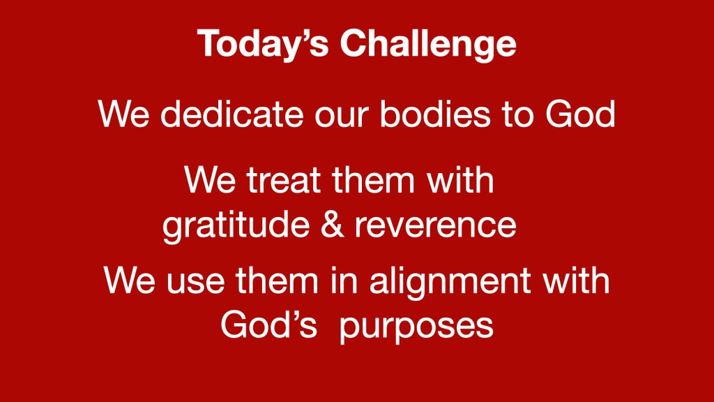 This means that what we do with our bodies is very important. Our bodies have been redeemed by Jesus and given a new purpose and future. Therefore, in response to God’s love, we use our bodies to glorify Him – aligning our thoughts, words, and deeds with God—while refraining from combining our bodies with sin.