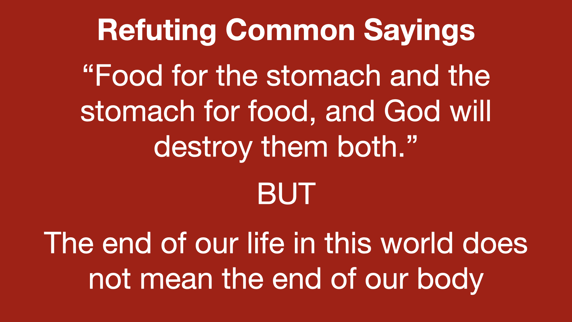 Then Paul addresses a second common saying: “Food for the stomach and the stomach for food, but God will destroy them both.” Again, there’s a grain of truth in this statement because food satisfies the hunger of the stomach and the stomach is designed to digest the food we eat. Furthermore, a day will come when each of us will die and, given enough time, our bodies will eventually turn to dust. However, the end of our life in this world does not mean the end of our bodies.