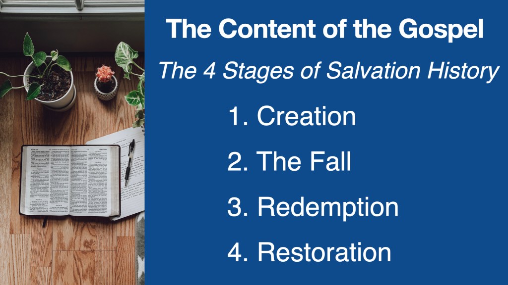 Paul is telling us that the content of the Gospel is that Jesus died for our sins and then rose from the dead. To provide you with a framework for understanding the Gospel, let’s look at the four stages of salvation history as God has revealed them to us in the Bible. Salvation history is the story of God’s interactions with humanity on Earth and how he is engaged in the process of saving us.