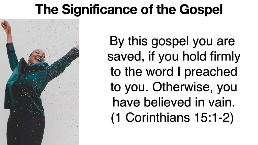 Paul is saying, “Hang on to the content of the Gospel because the significance of it is that God will save you through this message!” Here’s why this is important: If you choose not to believe in the Gospel, those four stages of salvation history still stand. You would still be part of God’s creation, beautifully and wonderfully made by Him. However, you would also bear the consequences of The Fall, with sin residing within you, corrupting your thoughts, words, and deeds. And you would carry the burden of sin’s consequences.