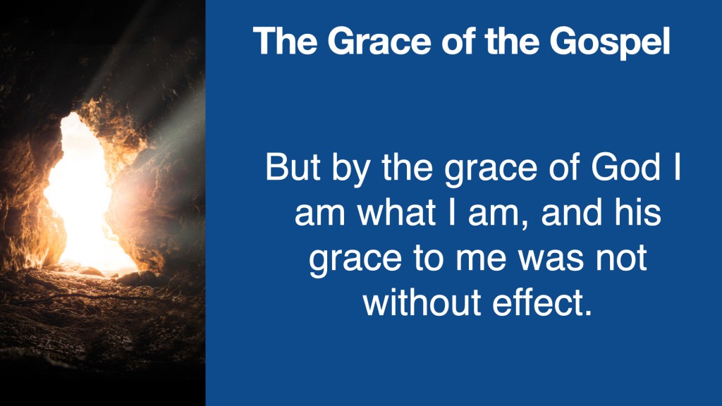 Then Paul talks about the grace of the Gospel. He writes, “And last of all,” [speaking of Jesus’s resurrection appearances,] “he appeared to me also, as to one abnormally born. For I am the least of the apostles and do not even deserve to be called an apostle, because I persecuted the church of God. But by the grace of God, I am what I am, and his grace to me was not without effect. No, I worked harder than all of them—yet not I, but the grace of God that was with me.” (1 Corinthians 15:8-10)