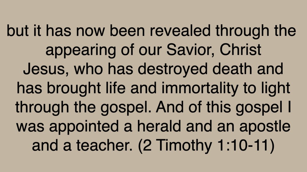 But then there’s this word “gospel,” and turning to Paul’s letter, we read, “But it is now being revealed [he’s referring to grace here] through the appearing of our Savior, Christ Jesus, who has destroyed death and has brought life and immortality to light through the gospel. Of this gospel, I was appointed a herald and an apostle and a teacher.” (2 Timothy 1:10-11) God’s grace was given to you before the creation of the world, and then that grace was revealed when Jesus Christ came into the world. He came on the scene in human history and through the perfect human life that He lived and the horrible sinner’s death that He died and His resurrection from the dead on the third day after His death, Jesus has destroyed death and given us the gift of life forever with Him. And Jesus’ resurrection changes everything for us because it means that we now have the opportunity to live a new life and we now have the opportunity to live in a new way. And it’s the gospel that ushers us into that new life and that new way of living.