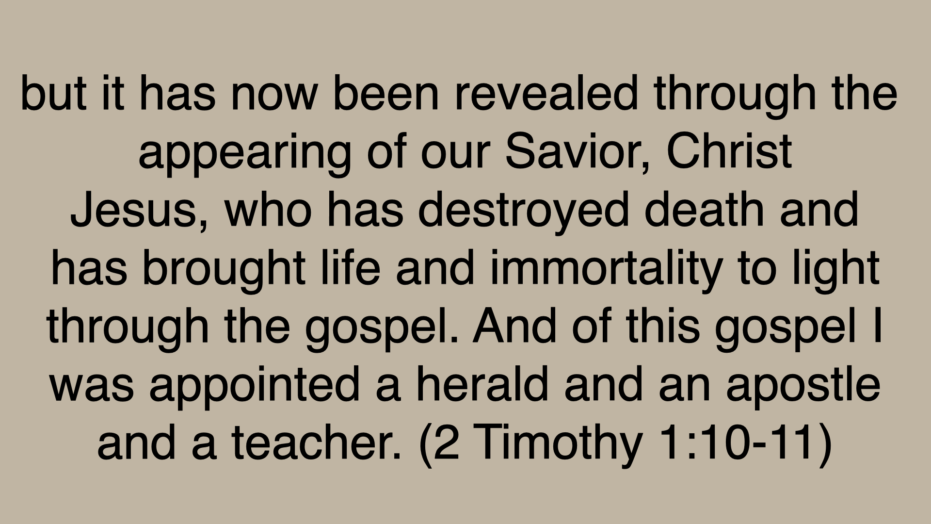 But then there’s this word “gospel,” and turning to Paul’s letter, we read, “But it is now being revealed [he’s referring to grace here] through the appearing of our Savior, Christ Jesus, who has destroyed death and has brought life and immortality to light through the gospel. Of this gospel, I was appointed a herald and an apostle and a teacher.” (2 Timothy 1:10-11) God’s grace was given to you before the creation of the world, and then that grace was revealed when Jesus Christ came into the world. He came on the scene in human history and through the perfect human life that He lived and the horrible sinner’s death that He died and His resurrection from the dead on the third day after His death, Jesus has destroyed death and given us the gift of life forever with Him. And Jesus’ resurrection changes everything for us because it means that we now have the opportunity to live a new life and we now have the opportunity to live in a new way. And it’s the gospel that ushers us into that new life and that new way of living.