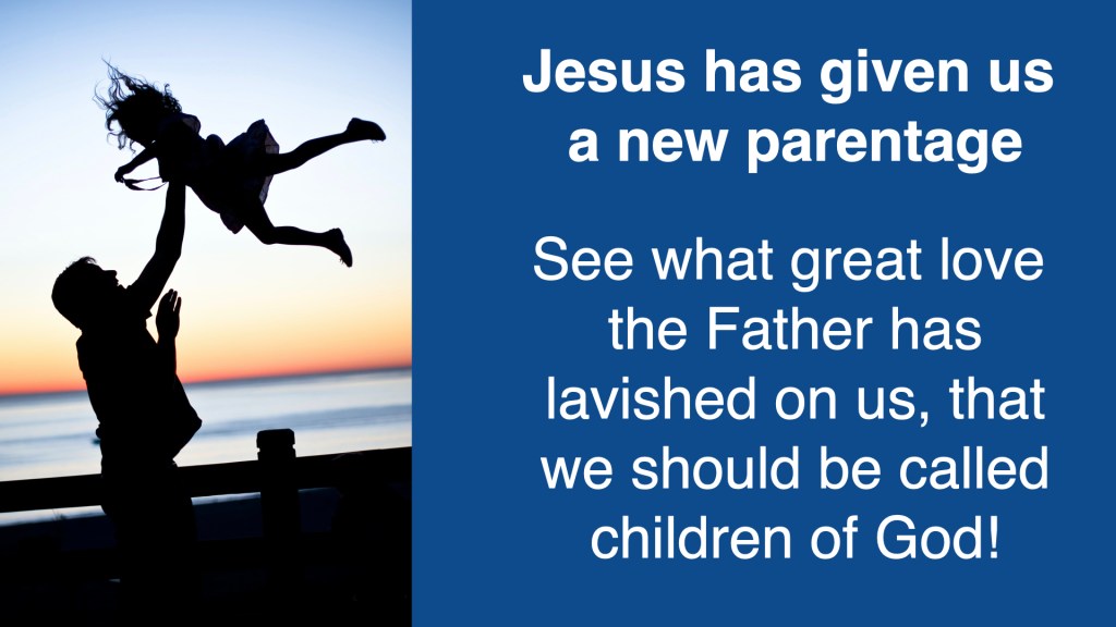 John writes, “See what great love the Father has lavished on us, that we should be called children of God! And that is what we are! The reason the world does not know us is that it did not know him.” (1 John 3:1) In the person of Jesus of Nazareth, God the Son came into this world and became fully human. It was love that motivated him to leave behind everything, all of the riches and glory that he had in Heaven, to become a helpless baby in a manger. And then, in human weakness, he lived a perfect life for you and for me. And when the time was just right, he willingly, lovingly went to the cross, to give his life for your life, so you could have his life in the family of God. Because he loves you, Jesus has made you a member of God’s family, you are a beloved, forgiven child of God, and that means that God the Father is your Father. That’s the new parentage that Jesus has given you.