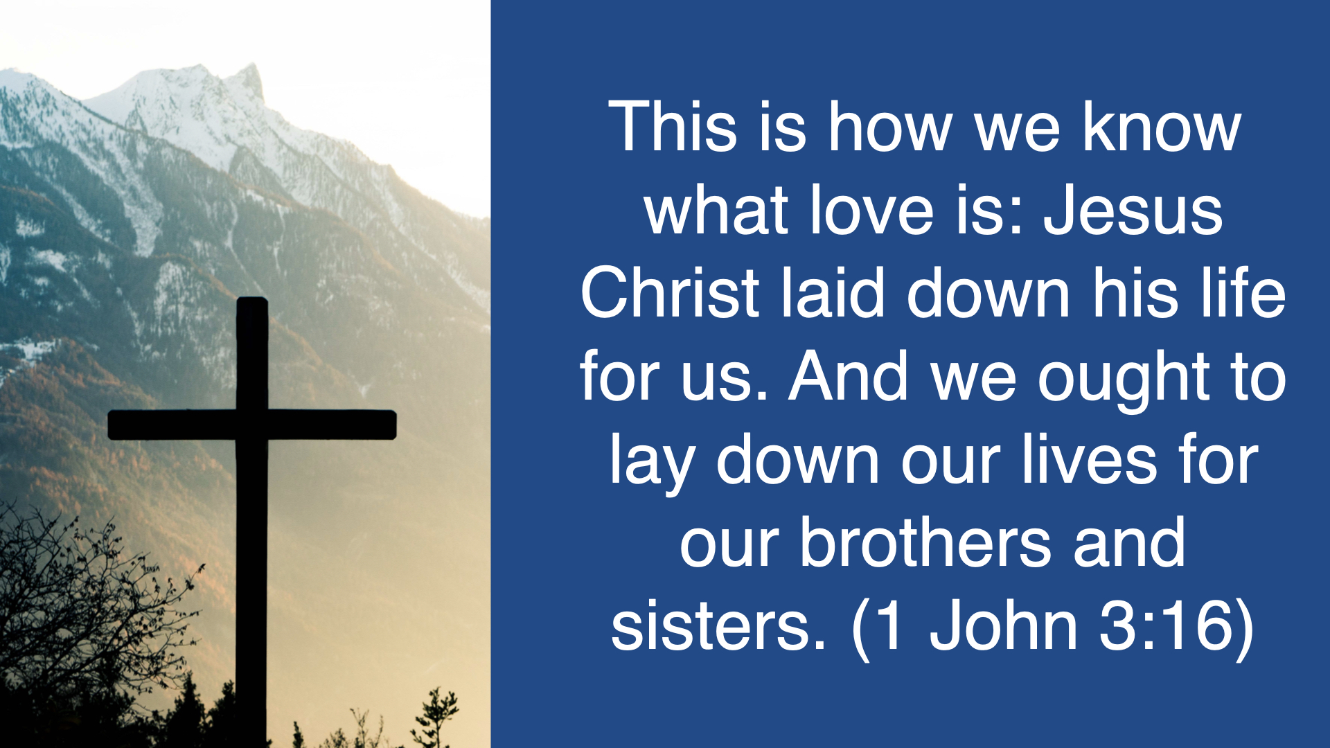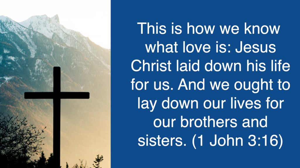 Please note that the second sentence in this verse describes our response to Jesus’ love for us. When we lay down our lives for others, it does not save us. Jesus has already done that for us. In response to what he has done for us we lay down our lives for the people around us.