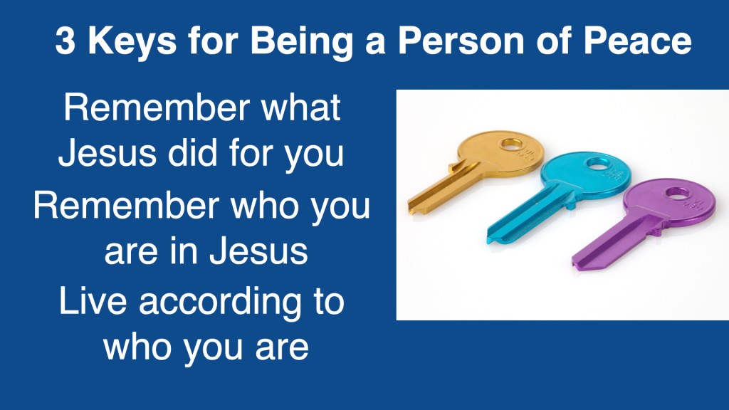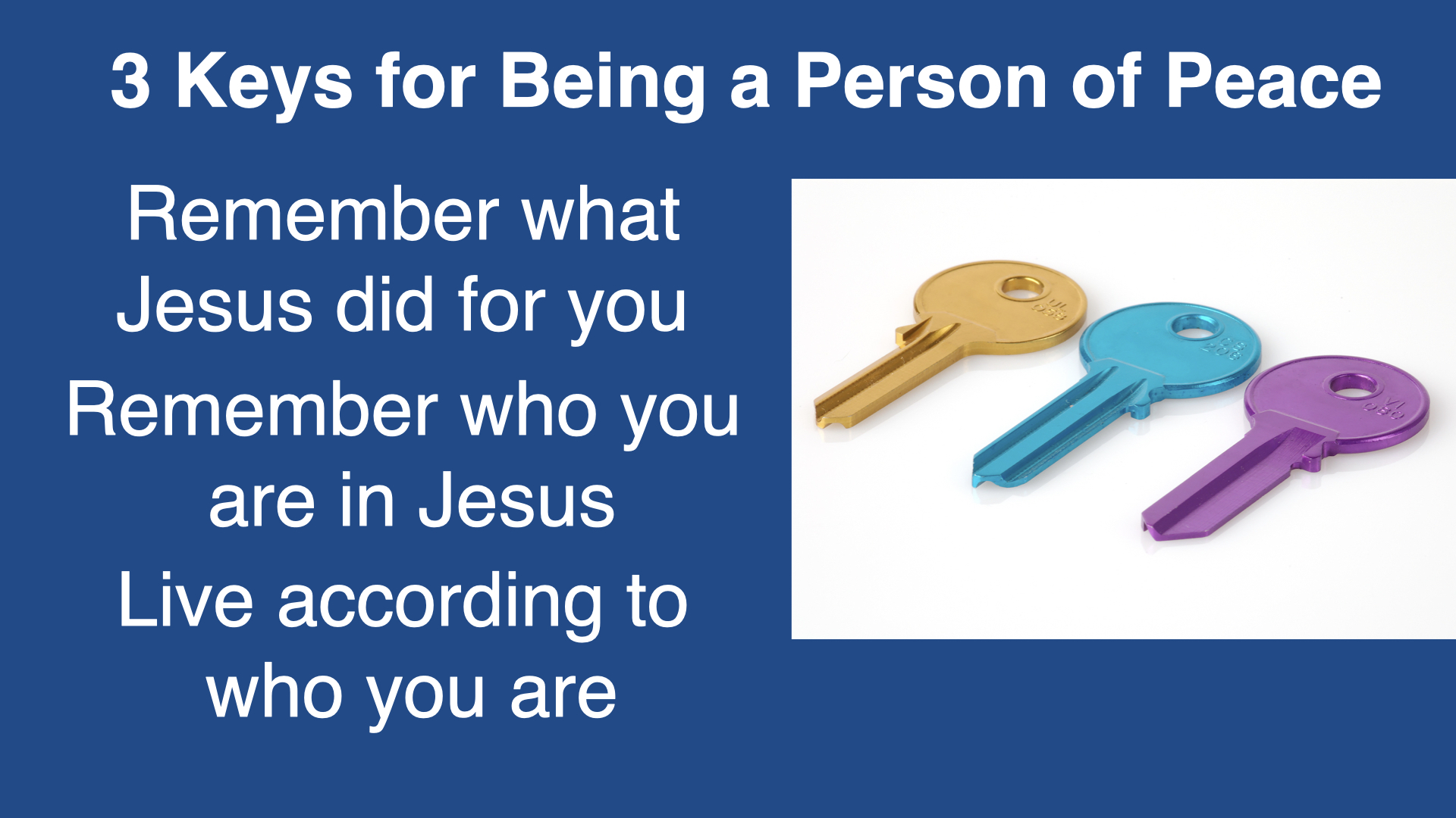 The second key to being a person of peace is: remember who you are in Jesus. You are a child of God, forgiven, beloved, unconditionally accepted without any reservation at all. And you have the same kind of intimate relationship with God the Father that Jesus has because he has given that to you. You can call on God at any time, about anything, anywhere, and know that he’s with you and he loves you. He will walk with you toward what he knows is the best outcome for you and all others. John points this out to us: “Dear friends, now we are children of God, and what we will be has not yet been made known. [We know who we are, but the world around us doesn’t.] But we know that when Christ appears [when he comes back and raises us from the dead and makes us and all things right again], we shall be like him, for we shall see him as he is.” (1 John 3:2)