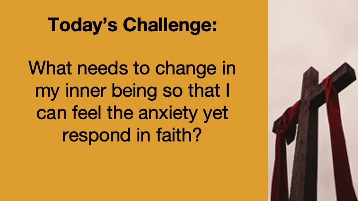 So the challenge that I wish to leave with you today is this, the next time you become anxious, ask yourself this question: What needs to change in my inner being so that I can feel the anxiety yet respond in faith? Amen.