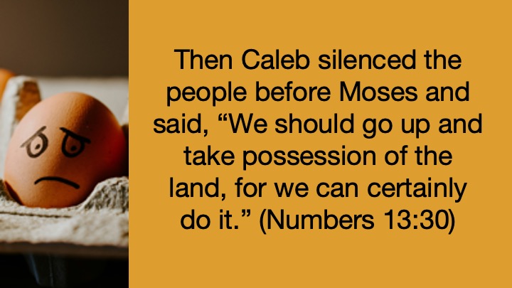 Turning back to our passage, we read: Then Caleb silenced the people before Moses and said, “We should go up and take possession of the land, for we can certainly do it.” (Numbers 13:30) Note that Caleb is not disputing the fact that there are giants in the land, he is simply trying to counter the spreading anxiety by speaking in favor of doing what God had called them to do and trusting that God would provide the victory.