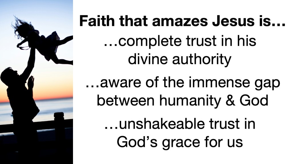 Dear friends, our faith does not depend at all on us. Our faith depends totally on Jesus. He is the One who makes our faith amazing. For faith which amazes God is simply trust that God will do amazing things in our life. So, we trust unconditionally in Jesus and his authority in all realms of our life, even when things do not turn out the way we hoped, because we know that he is at work in our lives making all things, even the hard times, work out for our good in the end. Amen.