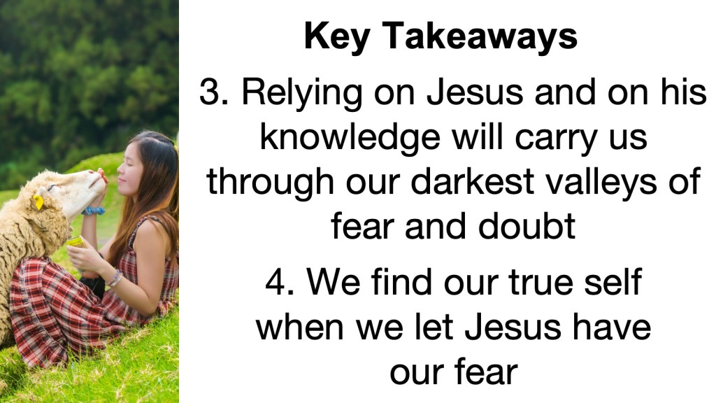 Fourth, we find our true self when we let Jesus have our fear. Peter wanted to be the kind of person who would lay down his life for Jesus, but his fear derailed him into a path of shame. I think that seeing the resurrected Jesus was what took away Peter’s fear. What was there left to be afraid of when Jesus had defeated humanity’s greatest enemy, death?