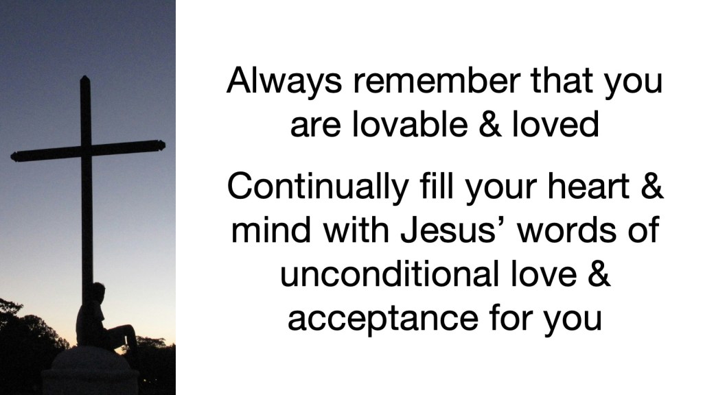 Dear friends, always remember that you are lovable and loved. Jesus has proven that by dying on the cross and rising again so that he could live with you and you could live with him forever. Whenever an external or internal voice speaks a word of shame to you, give that word to Jesus. And continually fill your heart and mind with his words of unconditional love and acceptance for you. Then you will be equipped to serve others with his love as he has loved and served you. Amen.