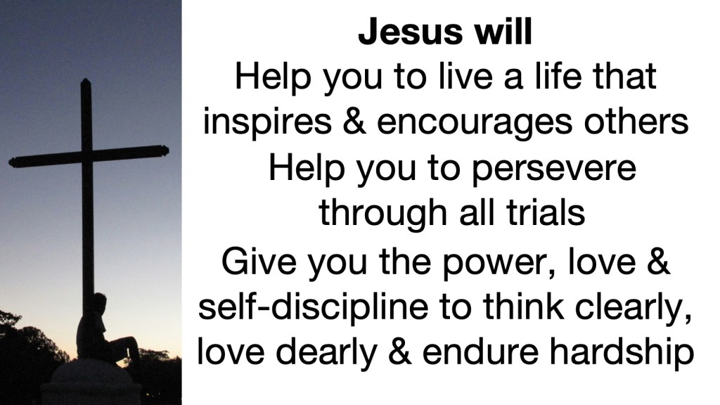 Jesus will help you to live a life that inspires and encourages others. He will help you to persevere through all the dangers and trials you will face. And Jesus will be with you to give you the power, love and self-discipline you need to think clearly, love dearly, and endure hardship. Amen.
