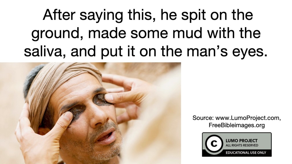 Now watch what Jesus does: After saying this, he spit on the ground, made some mud with the saliva, and put it on the man’s eyes. “Go,” he told him, “wash in the Pool of Siloam” (this word means “Sent”). So the man went and washed, and came home seeing. (John 9:6-7)