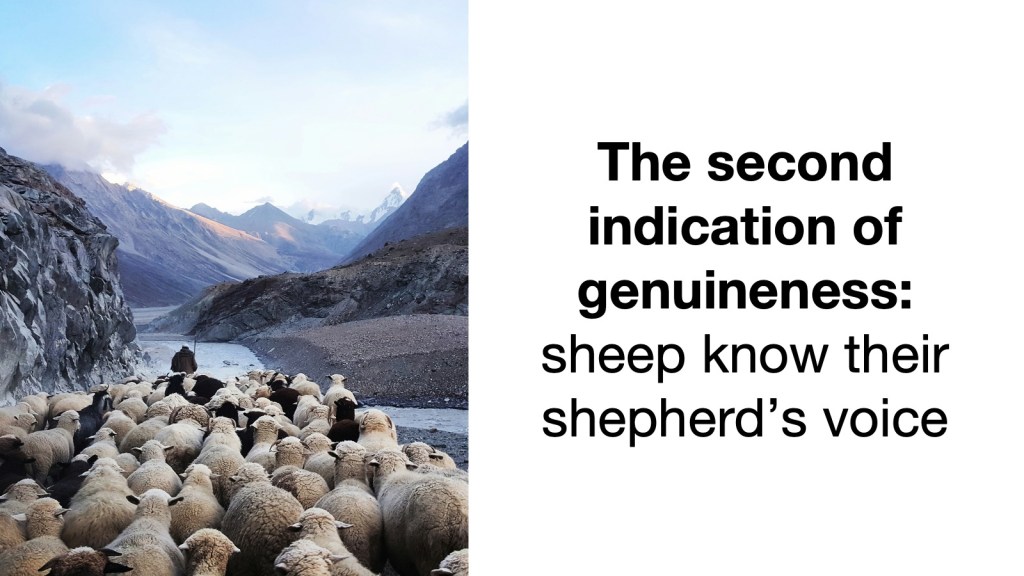The second indication of genuineness is that sheep know their shepherds. Let’s go back to the blind man. The Pharisees investigated the healing, and they found that it was genuine. They asked the man who had been healed to denounce Jesus, and he wouldn’t, and the Pharisees excommunicated him. They threw him out of the fellowship of his own people.
