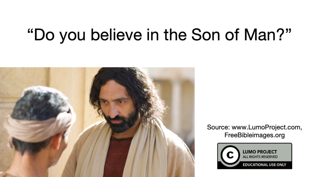 “Do you believe in the Son of Man?” (The term “Son of Man” was a nickname that Jesus would use to refer to himself and it hadMessianic connotations.).