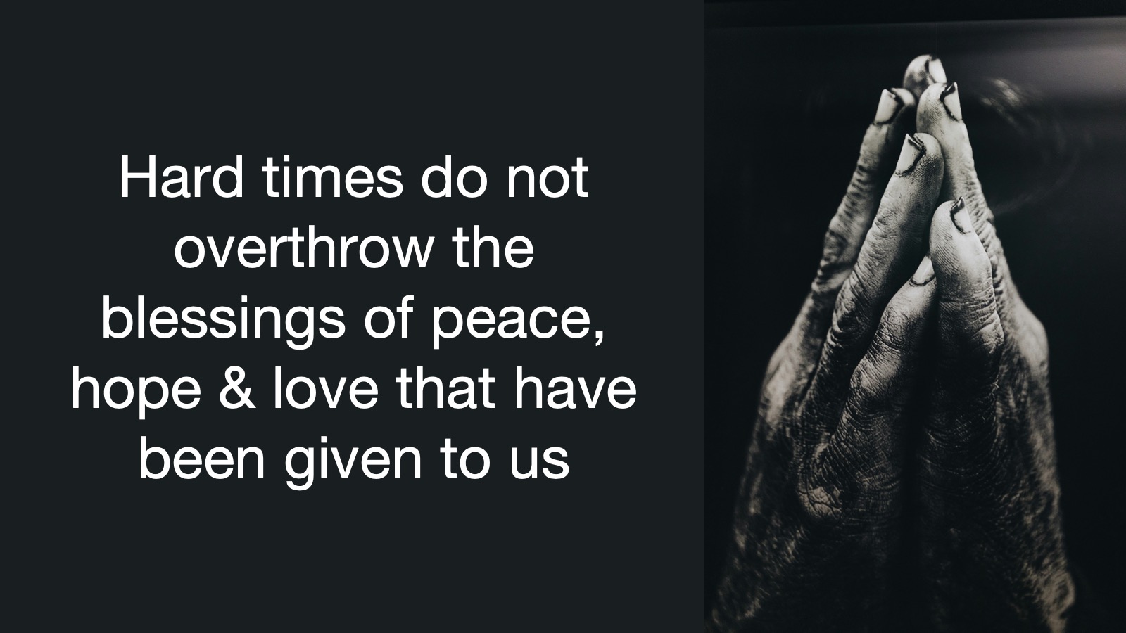This hope that we have is not derailed or diminished in any way by the pressure of the trials and tribulations we face in life, because hard times can not overthrow the blessings of peace and hope and love that Jesus has given to you. But hard times can bring the blessings Jesus has given us into sharper focus and make them sweeter for us. Years ago, one of my children nearly died from a drowning incident. I would not have chosen that experience for myself, nor would I have wished it for anyone else, but I experienced such an incredible closeness with God during that time that I am grateful for that experience.