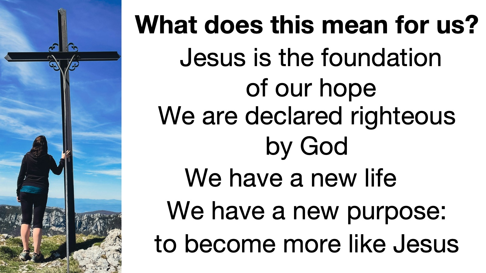 Jesus is the foundation of our hope. Because of His sacrifice for us, we are declared righteous by God through faith in Him. And because God has declared that we are righteous, we have a new life with God that is filled with peace and hope and love, and we have a new purpose, which is to become more like Jesus. And God can use the challenges that we face in life to deepen our relationship with Him and to further refine our character—to help us to become more like Jesus.