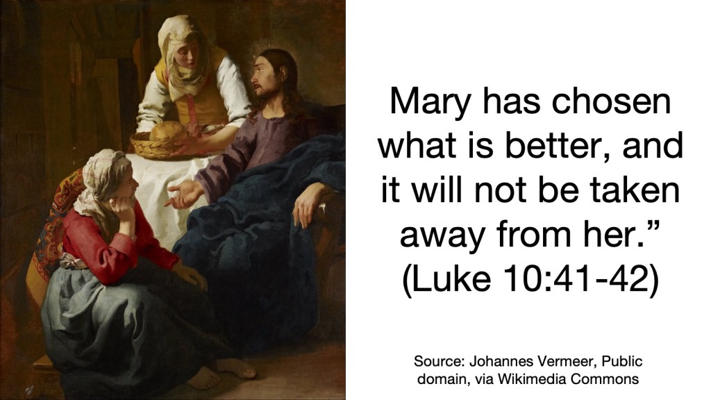 I’m guessing that many of us tend to be like Martha and focus on what we are doing with our efforts and energy. I know that I do that. But Jesus shows us that everything we do—our prayer, our worship, and even ordinary, everyday things like preparing a meal—are best begun by sitting at Jesus feet and receiving from him.