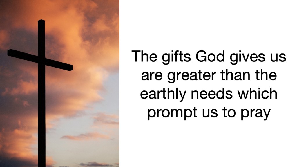God wants us to ask him for the things we need, and in the asking we learn that the gifts he gives us are greater than the earthly needs which prompt us to pray. We pray for bread for our hungry bellies, and God gives us that and more. He also gives us Jesus, the bread of life from heaven who nourishes our soul in this life and forever. We long for a portion of God’s holiness to be present among us, and God gives that and more. With the faith that the Holy Spirit has poured into our lives, God declares us to be completely holy in his sight as his Son, Jesus, who lives in us, and we live in him. We beg for deliverance from the various temptations that assault us, and God does do that and more. deliver us from evil. But it is more than a momentary rescue. For Jesus has made us new people with a new identity that is firmly anchored in him, not us. Jesus knows that we struggle with temptation and often succumb to sin, but when that happens it does not change how he sees us in any way, shape or form. And when we, by faith in him, begin to see ourselves as Jesus sees us, temptation loses its power to hook and hold us. After all, why would we settle for the false promise of temporary pleasure or power when the great gift of life in God’s kingdom is already ours?