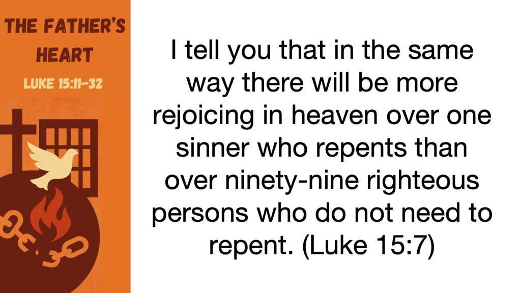 He says, “I tell you that in the same way, there will be more rejoicing in heaven over one sinner who repents than over ninety-nine righteous persons who do not need to repent.”