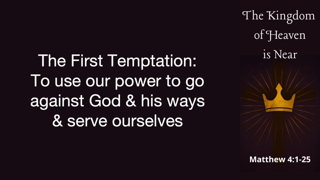 There were three temptations which the Israelites, Jesus and we face. The first temptation is to use our power to go against God and His ways and serve ourselves. In Exodus 16, we see that the Israelites, during their time in the wilderness, became and they began to grumble. In verse 3, we read, “The Israelites said to them, [that is Moses and Aaron,] “If only we had died by the Lord’s hand in Egypt. There we sat around pots of meat. We ate all the food we wanted, but you have brought us out into this desert to starve this entire assembly to death.” (Exodus 16:3)