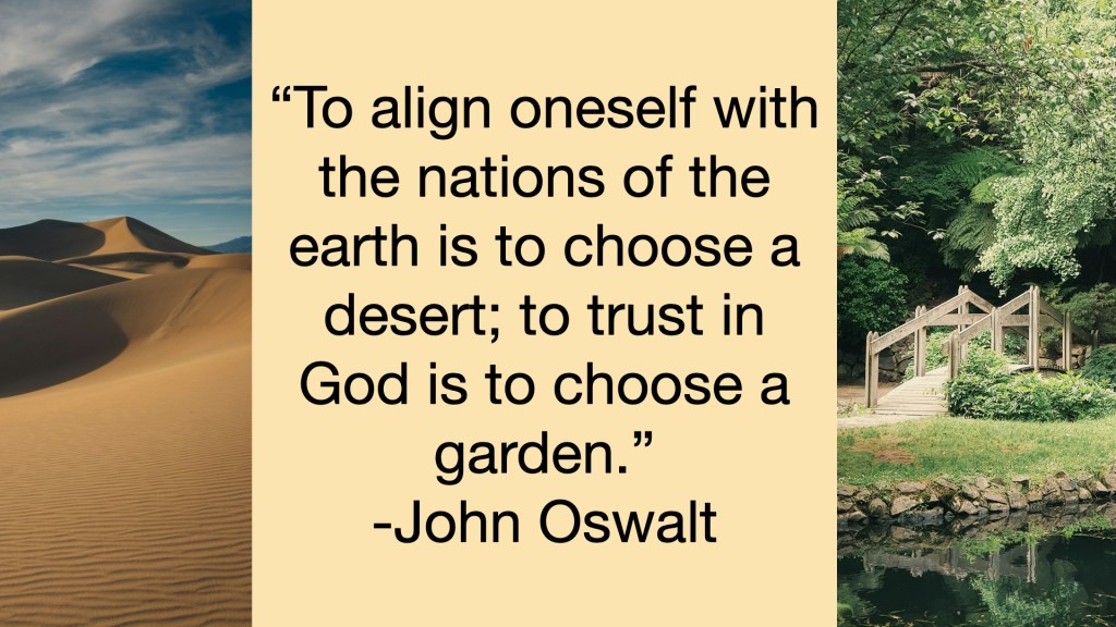 On the other hand, those who reject the enticements and temptations of the world and put themselves in the Lord’s hands and wait for him to save them—even though that may be happening in a time when they are in the middle of a desert—they will find themselves on a highway that leads to a glorious garden in which all things are healed, restored, and made new. As John Oswalt wrote in his Isaiah commentary: “To align oneself with the nations of the world is to choose a desert; to trust in God is to choose a garden.” [i]