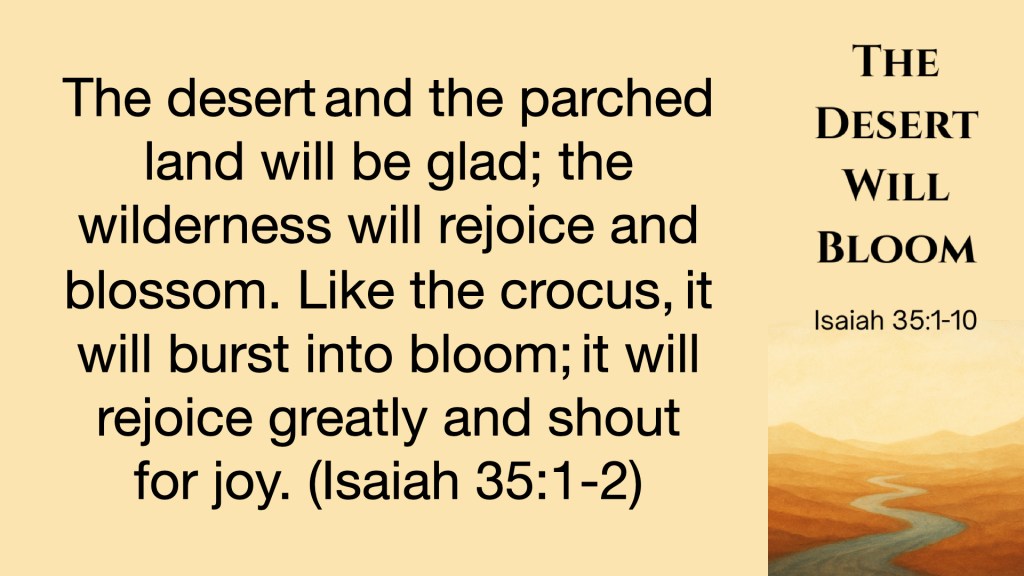 And Isaiah begins his description of God’s eternal spring in this way: “The desert and the parched land will be glad; the wilderness will rejoice and blossom like the crocus. It will burst into bloom; it will rejoice greatly and shout for joy.” (Isaiah 35:1–2)