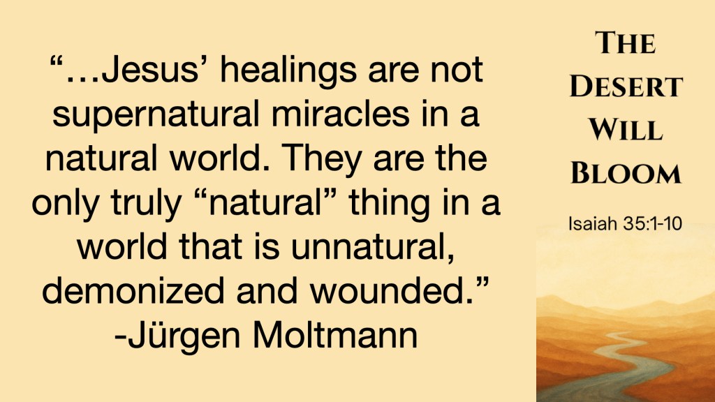 Now, we think of Jesus’ miracles as extraordinary exceptions to the natural way of things. A German theologian, Jürgen Moltmann, argues that the opposite is true. He wrote,