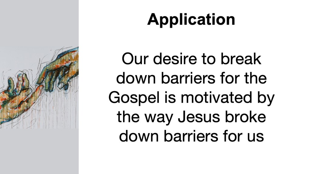 So what can we take from this story and apply to our lives today? First, our desire to break down barriers for the Gospel is motivated by the way Jesus broke down barriers for us. In our lost and broken state, without Jesus, there was no hope for us. But Jesus suffered and died on the cross to remove the barrier of sin between us and him. On the third day after his death, Jesus rose from the dead to remove the barrier of death between us and the life he has for us. We have been given the gift of life with Jesus and we want others to have that same gift too. That’s why we want to reach across and break down all barriers to the Gospel.