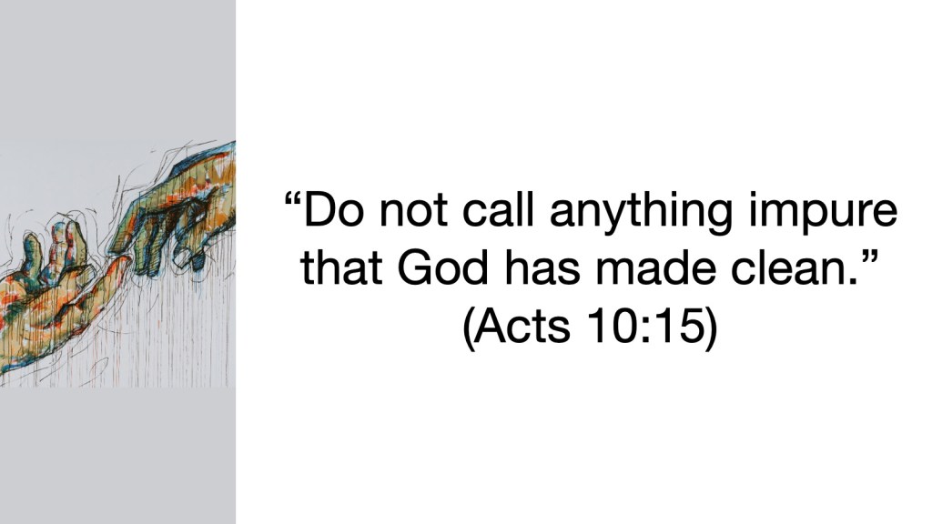 That all changed when God spoke to Cornelius through a vision and told him to send for Peter. While three men sent by Cornelius were on their way to Joppa to get Peter. Peter also had a vision from God in which a sheet fill with animals that the Jews considered to be unclean was lowered before him while a voice said, “Get up, Peter. Kill and eat.” Peter refused, and the voice responded, “Do not call anything impure that God has made clean.” (Acts 10:15)Three times this happened, and then the three men from Cornelius arrived at the home where Peter was staying. The Spirit said to Peter, using his other name, “Simon, three men are looking for you. 20 So get up and go downstairs. Do not hesitate to go with them, for I have sent them.” (Acts 10:19-20) So Peter went with them to Cornelius’ home in Caesarea.