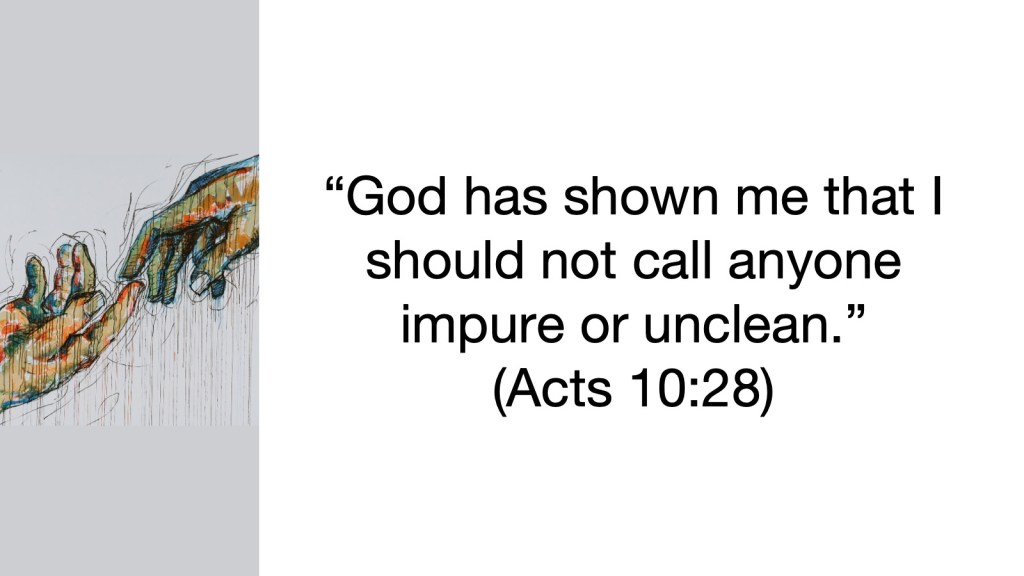 When they arrived, Cornelius graciously invited Peter into his home, and even though it was against Jewish law for him to do so, Peter accepted the invitation, saying, “God has shown me that I should not call anyone impure or unclean.” (Acts 10:28) Cornelius told Peter about the vision in which God told him to send for Peter. Peter responded by saying, “I now realize how true it is that God does not show favoritism but accepts from every nation the one who fears him and does what is right. (Acts 10:34-35). Peter then shared the Gospel with Cornelius and all his household, and as he did that, the Holy Spirit came upon them, and they begin speaking in tongues and praising God. The Jews who came with Peter from Joffa were amazed that the gift of the Holy Spirit had been given to Gentiles! Then Peter said, “Surely no one can stand in the way of their being baptized with water. They have received the Holy Spirit just as we have.” So he ordered that they be baptized in the name of Jesus Christ. (Acts 10:47-48)